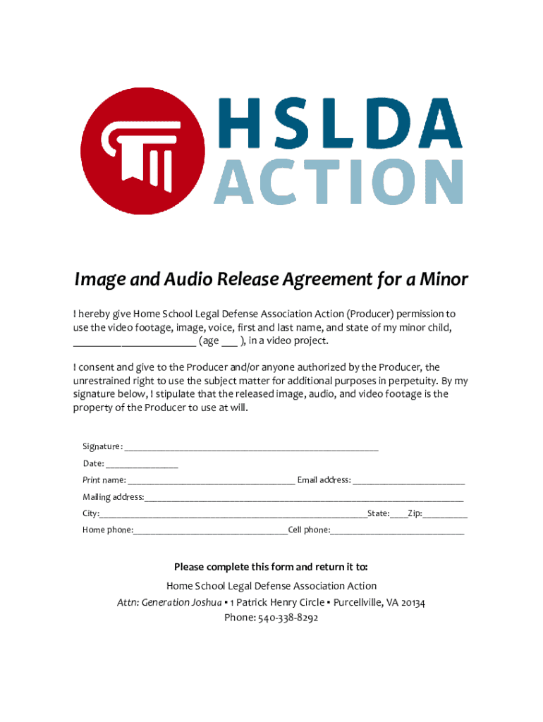 Image and Audio Release Agreement for a Minor I hereby give Home School Legal Defense Association Action (Producer) permission to use the video footage, image, voice, first and last name, and state