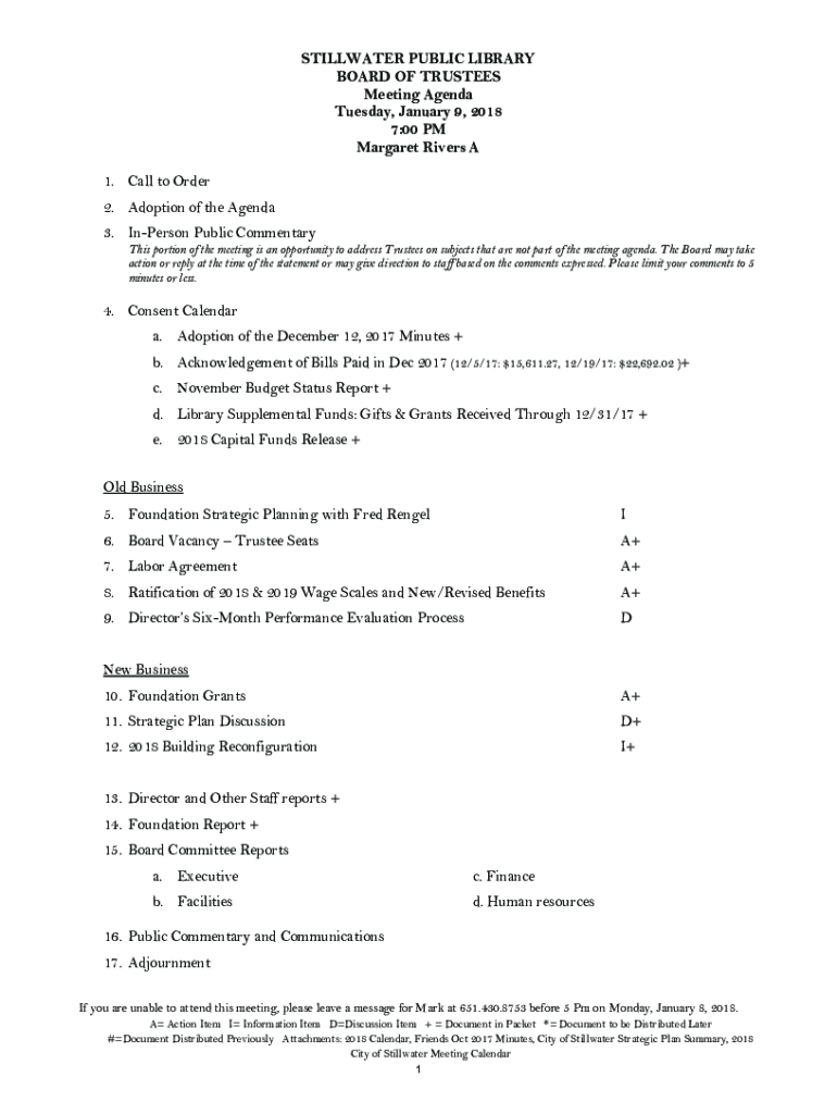 STILLWATER PUBLIC LIBRARY BOARD OF TRUSTEES Meeting Agenda Tuesday, January 9, 2018 7:00 PM Margaret Rivers A 1. Call to Order 2. Adoption of the Agenda 3. Unperson Public CommentaryThis portion of