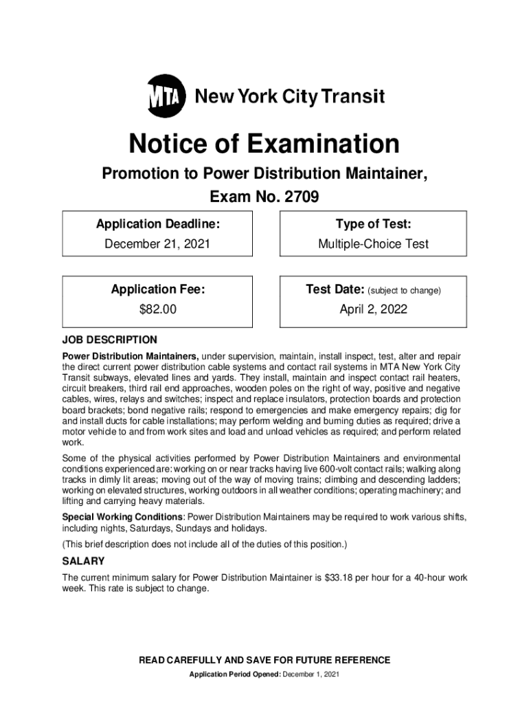 Notice of Examination Promotion to Power Distribution Maintainer, Exam No. 2709 Application Deadline:Type of Test:December 21, 2021MultipleChoice Misapplication Fee:Test Date: (subject to change)$82.00April
