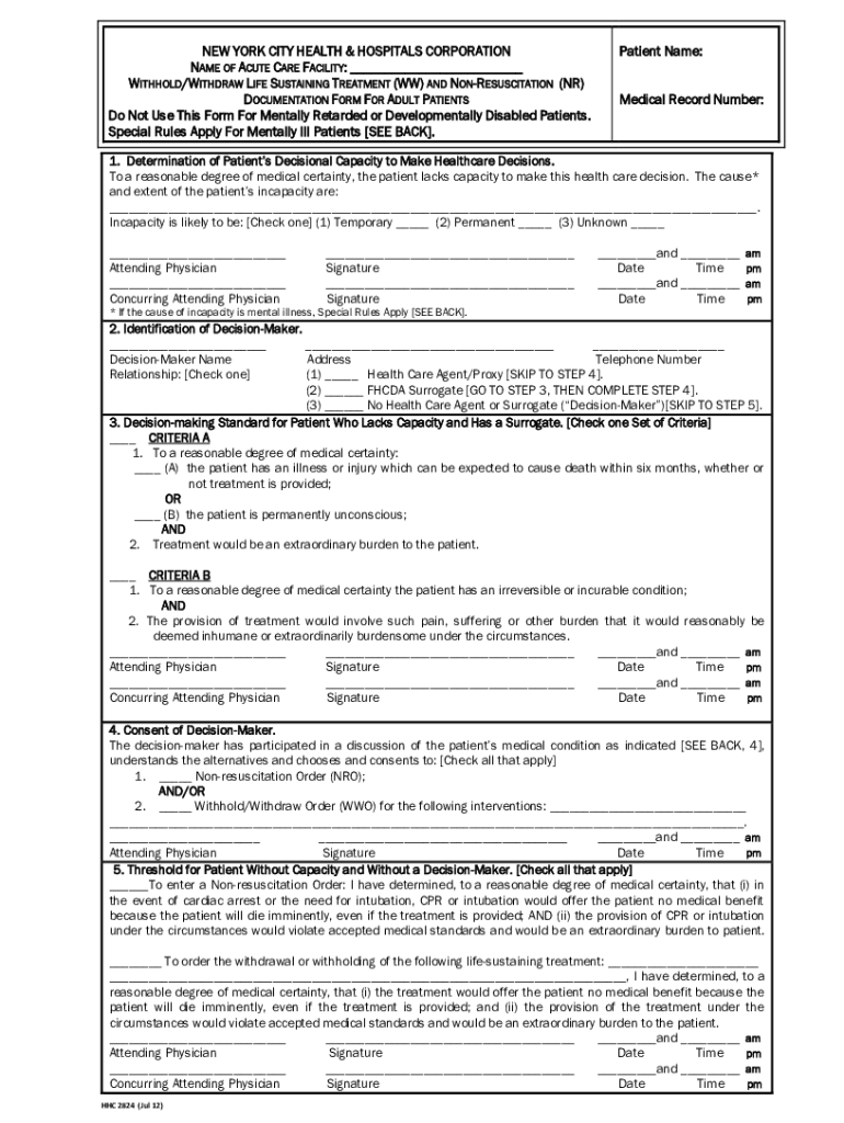 NEW YORK CITY HEALTH & HOSPITALS CORPORATION NAME OF ACUTE CARE FACILITY: ___ WITHHOLD/WITHDRAW LIFE SUSTAINING TREATMENT (WW) AND RESUSCITATION (NR) DOCUMENTATION FORM FOR ADULT PATIENTS Do Not Use