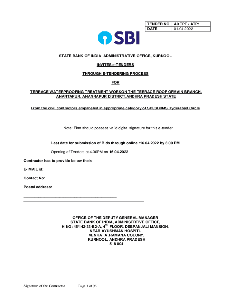 TENDER NO DATEA0 TPT / ATP/ 01.04.2022STATE BANK OF INDIA ADMINISTRATIVE OFFICE, KERNEL INVITES tenders THROUGH TENDERING PROCESS FOR TERRACE WATERPROOFING TREATMENT WORK ON THE TERRACE ROOF MAIN