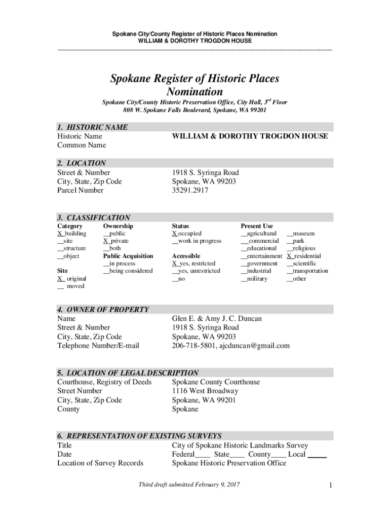 Spokane City/County Register of Historic Places Nomination WILLIAM & DOROTHY TRODDEN HOUSE ___Spokane Register of Historic Places Nomination Spokane City/County Historic Preservation Office, City