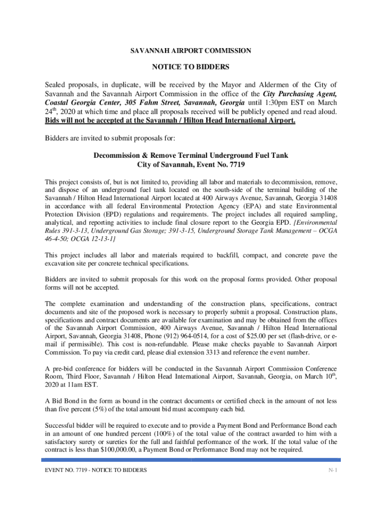 SAVANNAH AIRPORT COMMISSIONNOTICE TO BIDDERS Sealed proposals, in duplicate, will be received by the Mayor and Aldermen of the City of Savannah and the Savannah Airport Commission in the office of