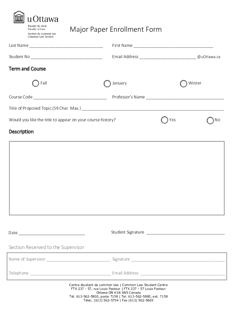 Major Paper Enrollment Form Last Name ___First Name ___Student No ___Email Address ___ Ottawa. Cater and Course FallJanuaryCourse Code ___WinterProfessors Name ___Title of Proposed Topic (59 Char.