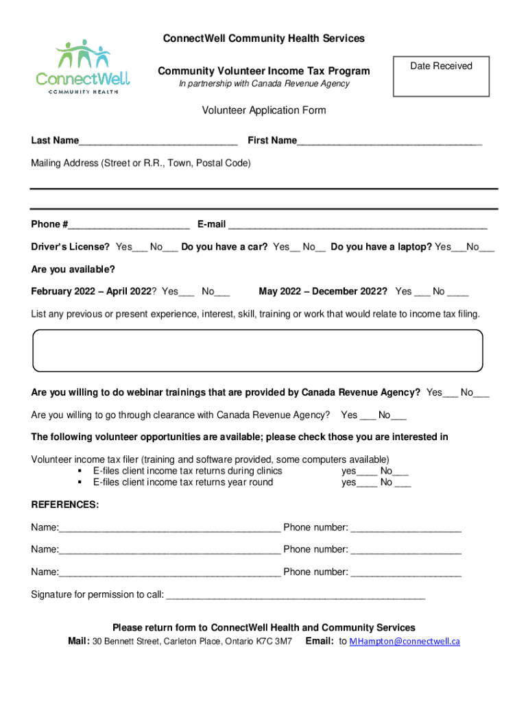 Connected Community Health Services Community Volunteer Income Tax Programmable Received In partnership with Canada Revenue AgencyVolunteer Application Form Last Name___First Name___Mailing Address
