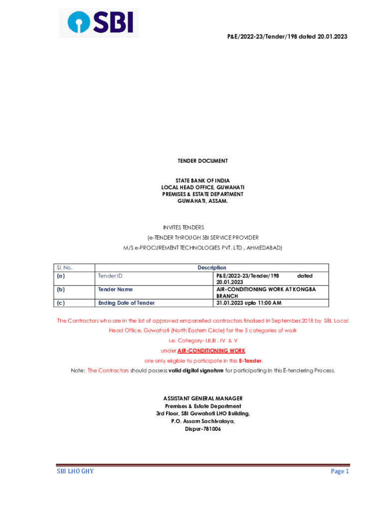 P&E/202223/Tender/198 dated 20.01.2023TENDER DOCUMENT STATE BANK OF INDIA LOCAL HEAD OFFICE, GUWAHATI PREMISES & ESTATE DEPARTMENT GUWAHATI, ASSAM.INVITES TENDERS (tender THROUGH SBI SERVICE PROVIDER