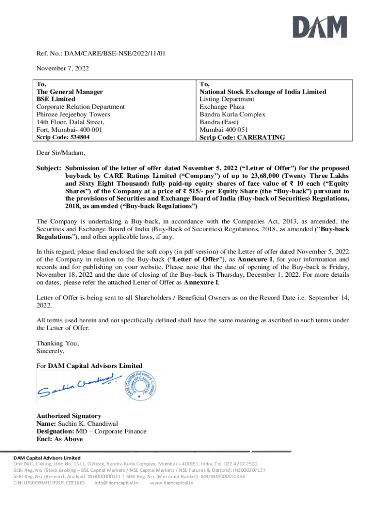 Ref. No.: DAM/CARE/SENSE/2022/11/01 November 7, 2022, To, The General Manager BSE Limited Corporate Relation Department Phone Jeejeeboy Towers 14th Floor, Daley Street, Fort, Mumbai 400 001 Scrip