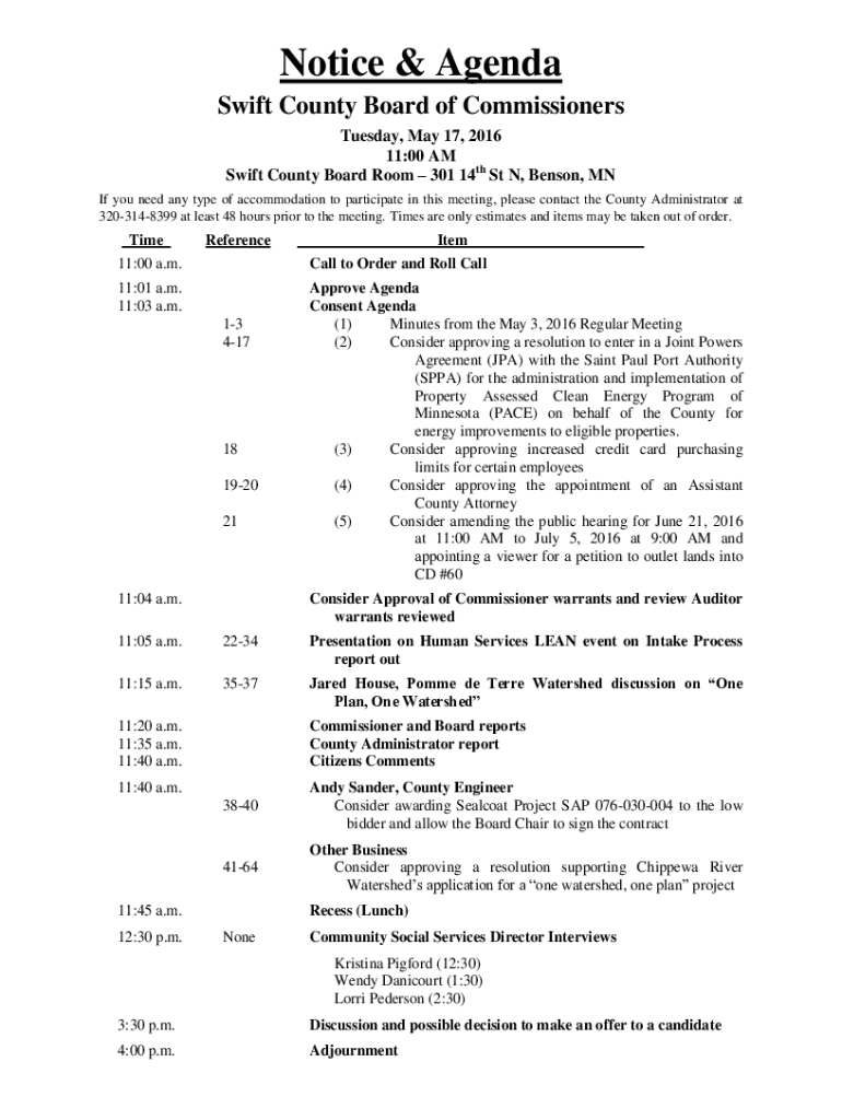 Notice & Agenda Swift County Board of Commissioners Tuesday, May 17, 2016 11:00 AM Swift County Board Room 301 14th St N, Benson, MN If you need any type of accommodation to participate in this meeting,
