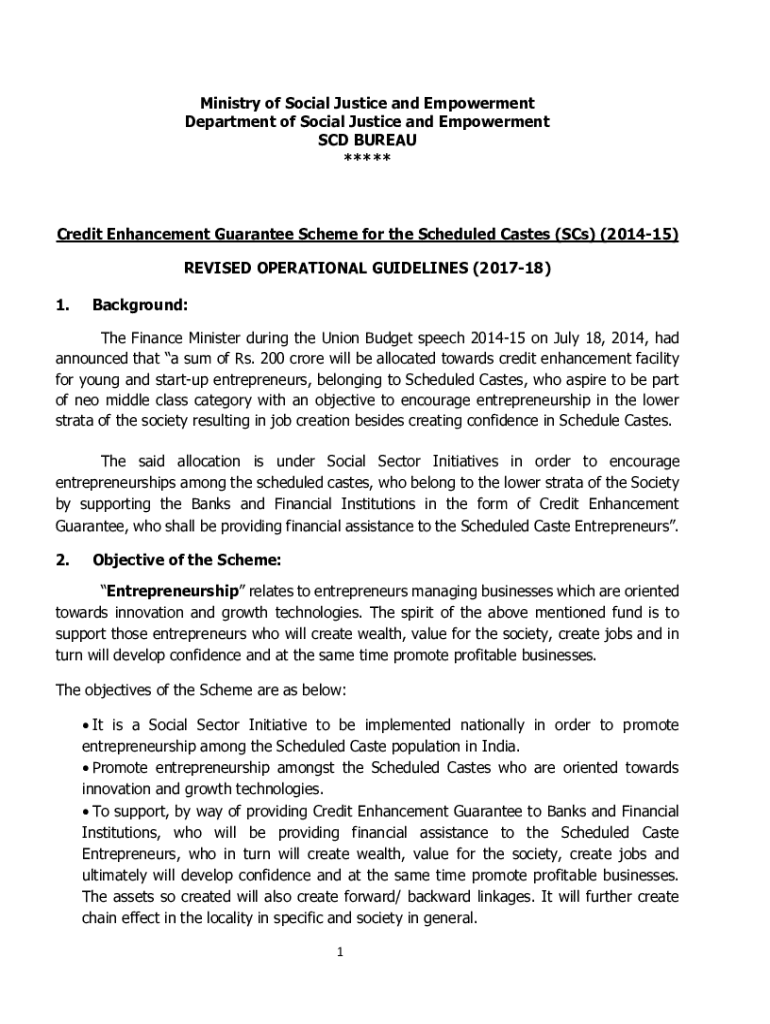 Ministry of Social Justice and Empowerment Department of Social Justice and Empowerment SCD BUREAU *****Credit Enhancement Guarantee Scheme for the Scheduled Castes (SC's) (201415) REVISED OPERATIONAL