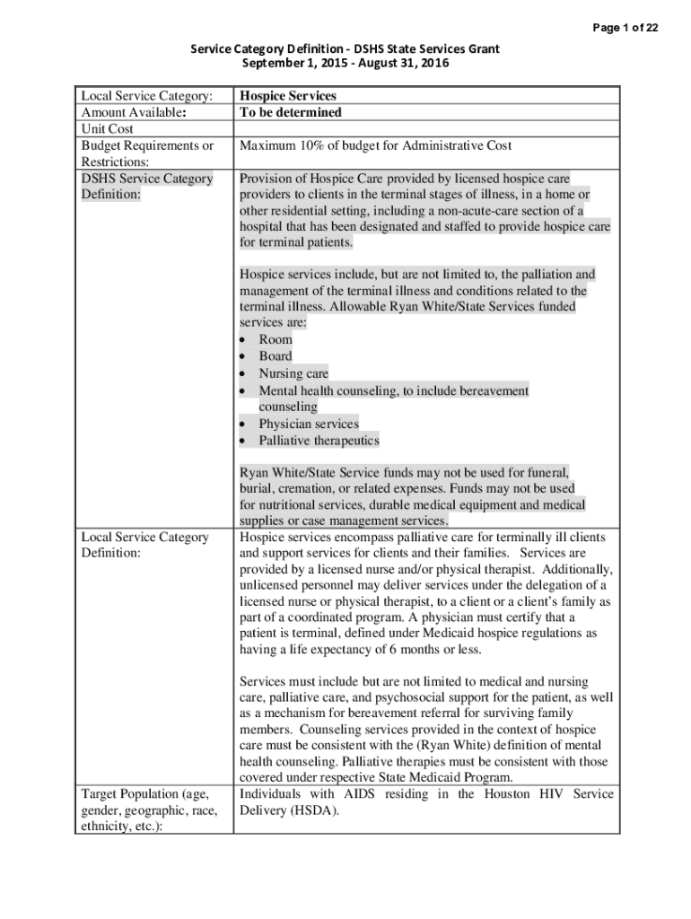Page 1 of 22Service Category Definition DSS State Services Grant September 1, 2015, August 31, 2016, Local Service Category: Amount Available: Unit Cost Budget Requirements or Restrictions: DSS Service