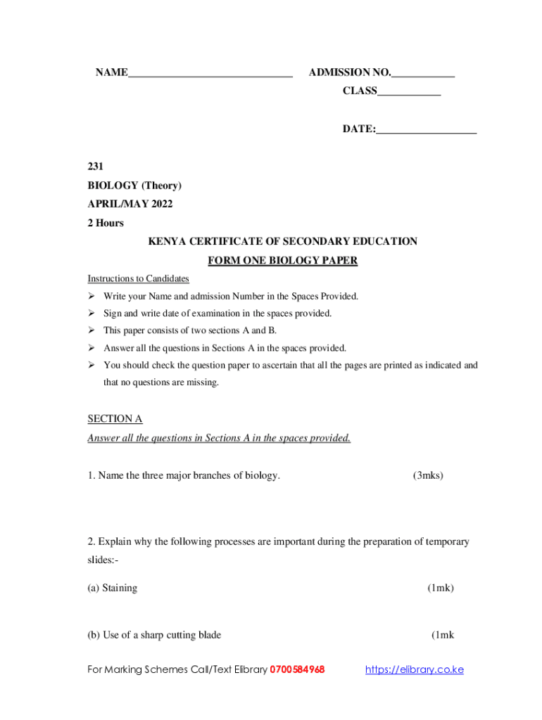 NAME___ADMISSION NO.___ CLASS___DATE:___231 BIOLOGY (Theory) APRIL/MAY 2022 2 Hours KENYA CERTIFICATE OF SECONDARY EDUCATION FORM ONE BIOLOGY PAPER Instructions to Candidates Write your Name and admission