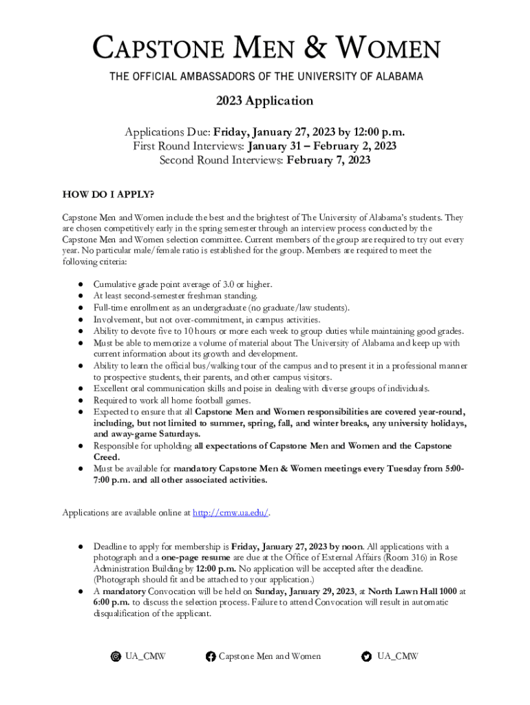 CAPSTONE MEN WOMEN OFFICIALAMBASSADORSOF THE UNIVERSITY ALABAMA2023 Application Applications Due: Friday, January 27, 2023, by 12:00 p.m. First Round Interviews: January 31 February 2, 2023, Second
