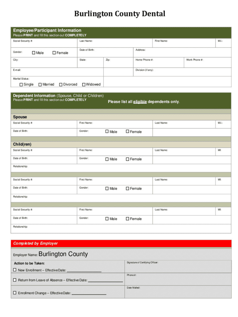 Burlington County Dental Employee/Participant Information Please PRINT and fill this section out COMPLETELY Social Security #:Last Name:First Name:Date of Birth:Gender:Male. I.:Address:Felicity:State:Zip:Email:Home