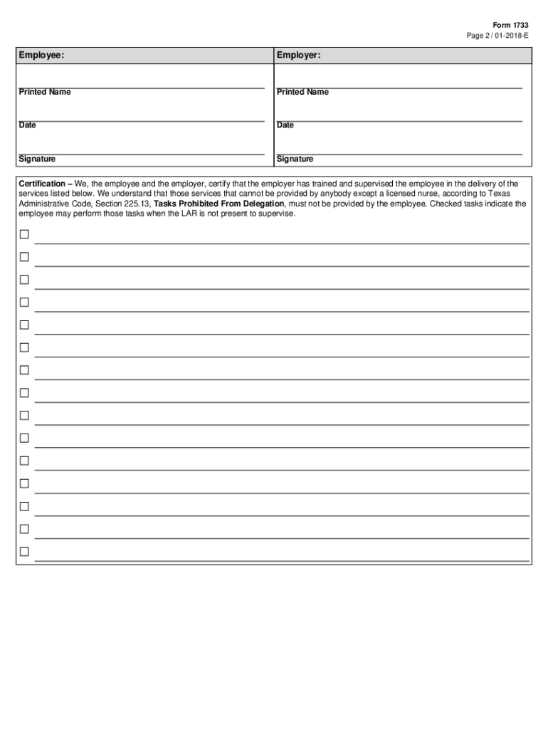 Form 1733 January 2018EEmployer and Employee Acknowledgement of Exemption from Nursing Licensure for Certain Services Delivered through Consumer Directed Services The employer in the Consumer Directed