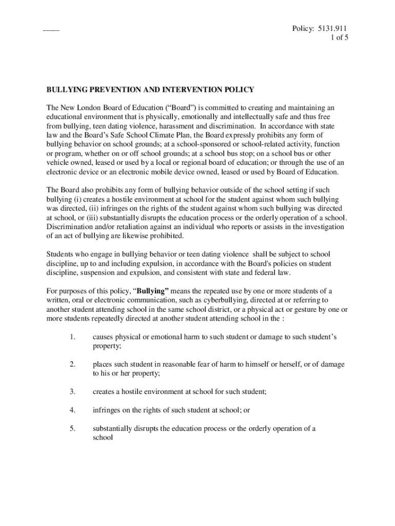 ___Policy: 5131.911 1 of 5BULLYING PREVENTION AND INTERVENTION POLICY The New London Board of Education (Board) is committed to creating and maintaining an educational environment that is physically,