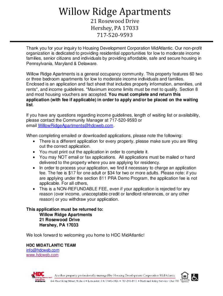 Willow Ridge Apartments 21 Rosewood Drive Hershey, PA 17033 7175209593Thank you for your inquiry to Housing Development Corporation mid-Atlantic. Our nonprofit organization is dedicated to providing