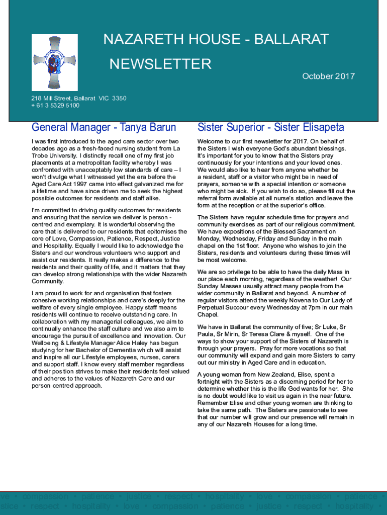 NAZARETH HOUSE BALLARAT NEWSLETTER October 2017218 Mill Street, Ballarat VIC 3350 + 61 3 5329 5100General Manager Tanya Barrister Superior Sister Elisabeth was first introduced to the aged care sector