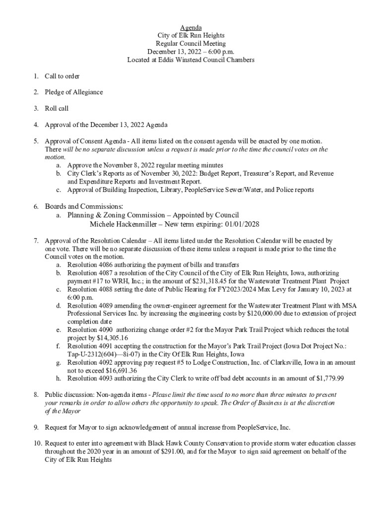 Agenda City of Elk Run Heights Regular Council Meeting December 13, 2022 6:00 p.m. Located at Eddie Instead Council Chambers 1. Call to order 2. Pledge of Allegiance 3. Roll call 4. Approval of the