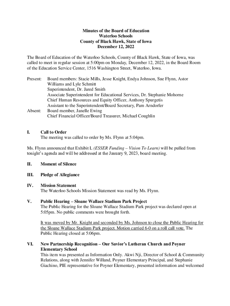 Minutes of the Board of Education Waterloo Schools County of Black Hawk, State of Iowa December 12, 2022, The Board of Education of the Waterloo Schools, County of Black Hawk, State of Iowa, was called