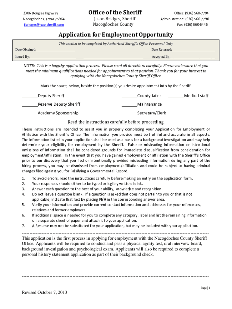 Office of the Sheriff2306 Douglas Highway Jason Bridges, Sheriff Nacogdoches CountyNacogdoches, Texas 75964 jbridges@nacsheriff.comOffice: (936) 5607794 Administration: (936) 5607790 Fax: (936) 5606446Application