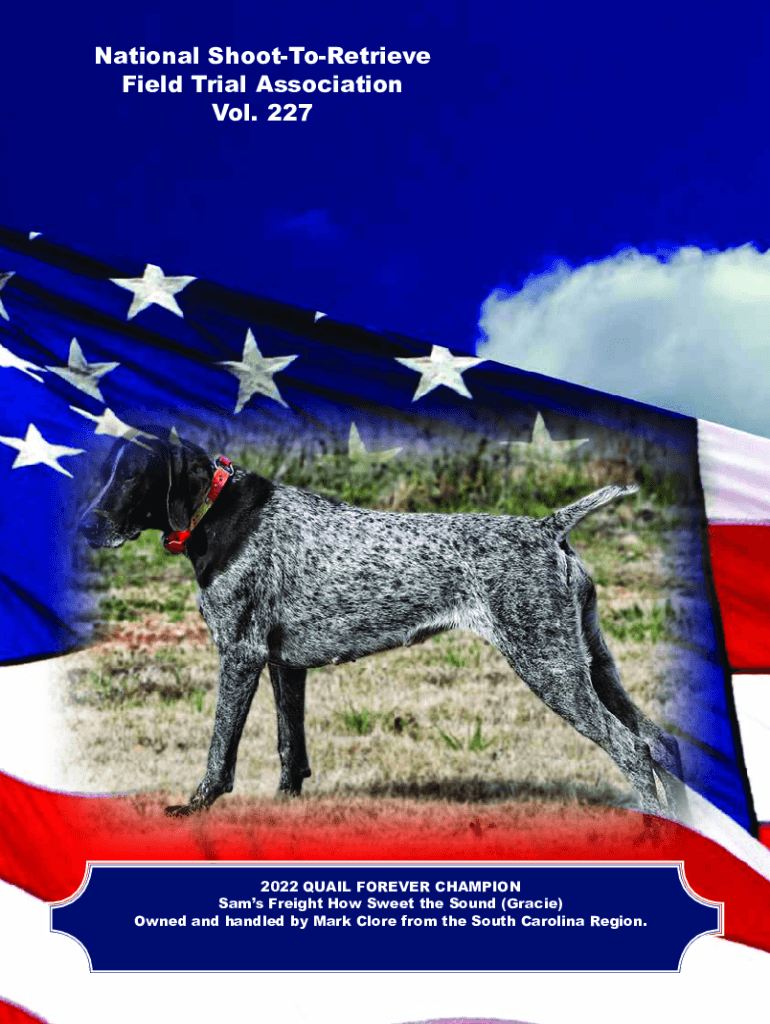 National ShootToRetrieve Field Trial Association Vol. 2272022 QUAIL FOREVER CHAMPION Sam's Freight How Sweet the Sound (Gracie) Owned and handled by Mark Close from the South Carolina Region.11th