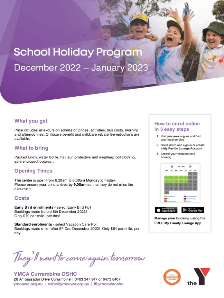 December 2022 January 2023What you get Price includes all excursion admission prices, activities, bus costs, morning and afternoon tea. Childcare benefit and childcare rebate fee reductions are available.