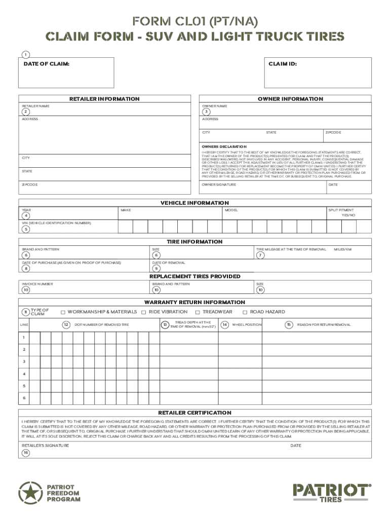 FORM CL01 (PT/NA) CLAIM FORM SUV AND LIGHT TRUCK TIRES 1DATE OF CLAIM:CLAIM ID:RETAILER INFORMATIONOWNER INFORMATIONRETAILER HOMEOWNER NAME23ADDRESSADDRESSCITYSTATEZIPCODEOWNERS DECLARATION I HEREBY