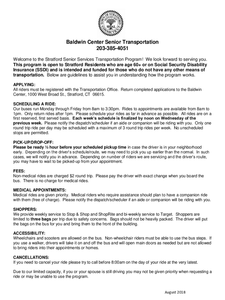 Baldwin Center Senior Transportation 2033854051 Welcome to the Stratford Senior Services Transportation Program! We look forward to serving you. This program is open to Stratford Residents who are