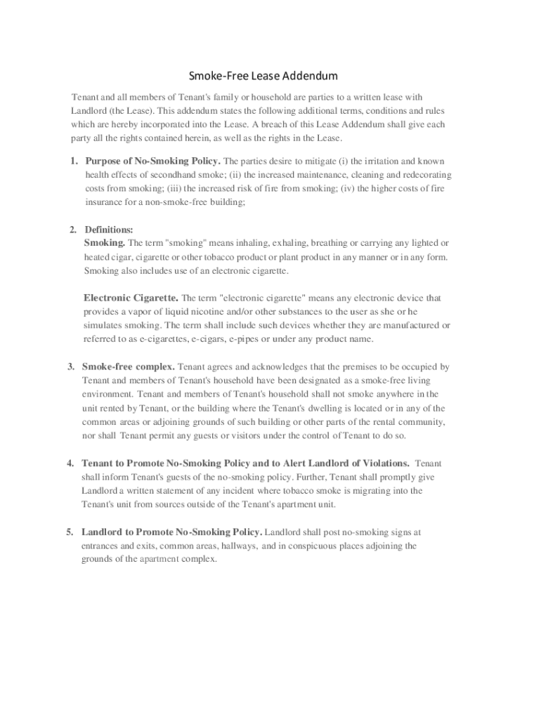 Smoke-free Lease Addendum Tenant and all members of Tenant\'s family or household are parties to a written lease with Landlord (the Lease). This addendum states the following additional terms, conditions