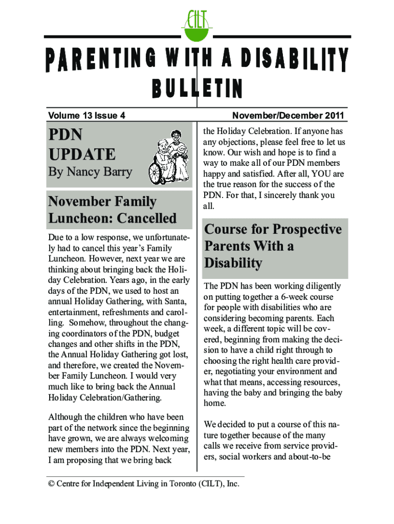 1Parenting with a Disability Bulletin, Vol. 134Volume 13 Issue 4PDN UPDATE By Nancy Barry November Family Luncheon: Cancelled Due to a low response, we unfortunate ly had to cancel this year's Family