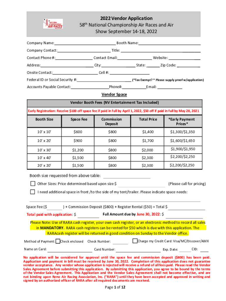 58th2022 Vendor Application National Championship Air Races and Air Show September 1418, 2022Company Name:Booth Name:Company Contact:___Title:Contact Phone #:___Contact Email:Address:Website:___ City:Onsite
