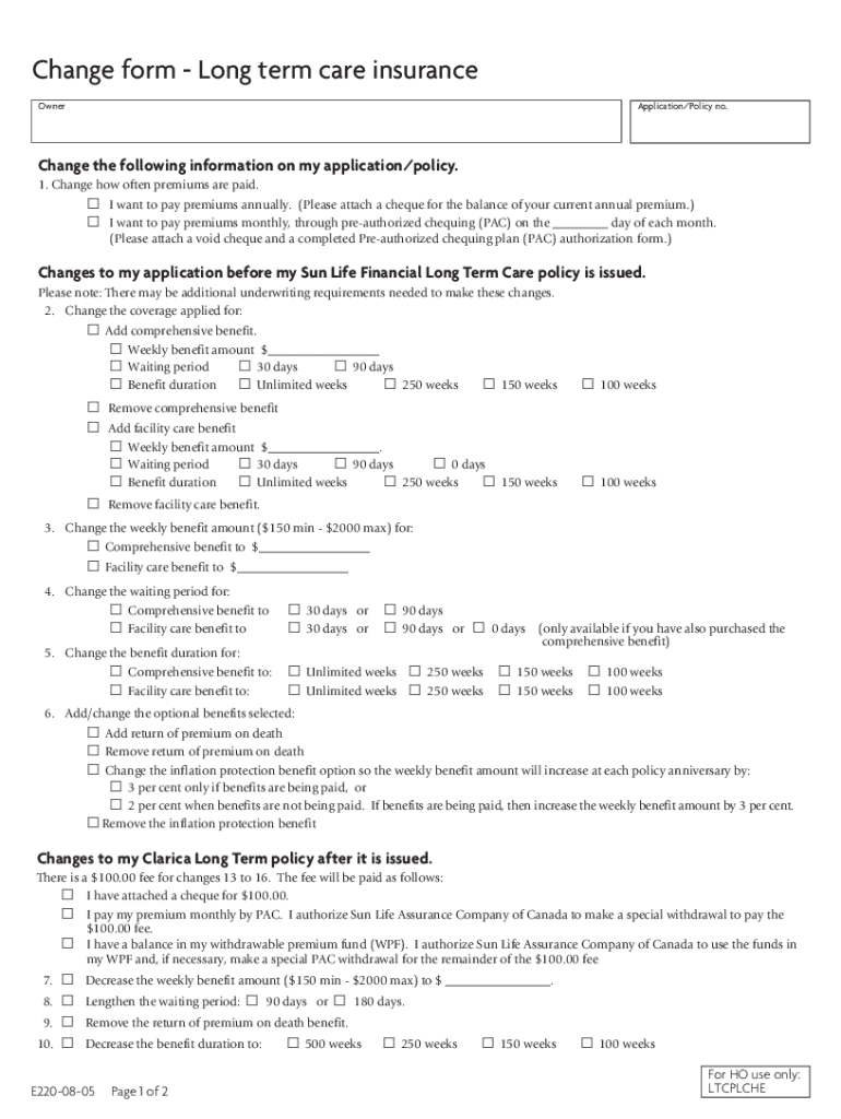 Change form Long term care insurance OwnerApplication/Policy no. Change the following information on my application/policy. 1. Change how often premiums are paid. I want to pay premiums annually.