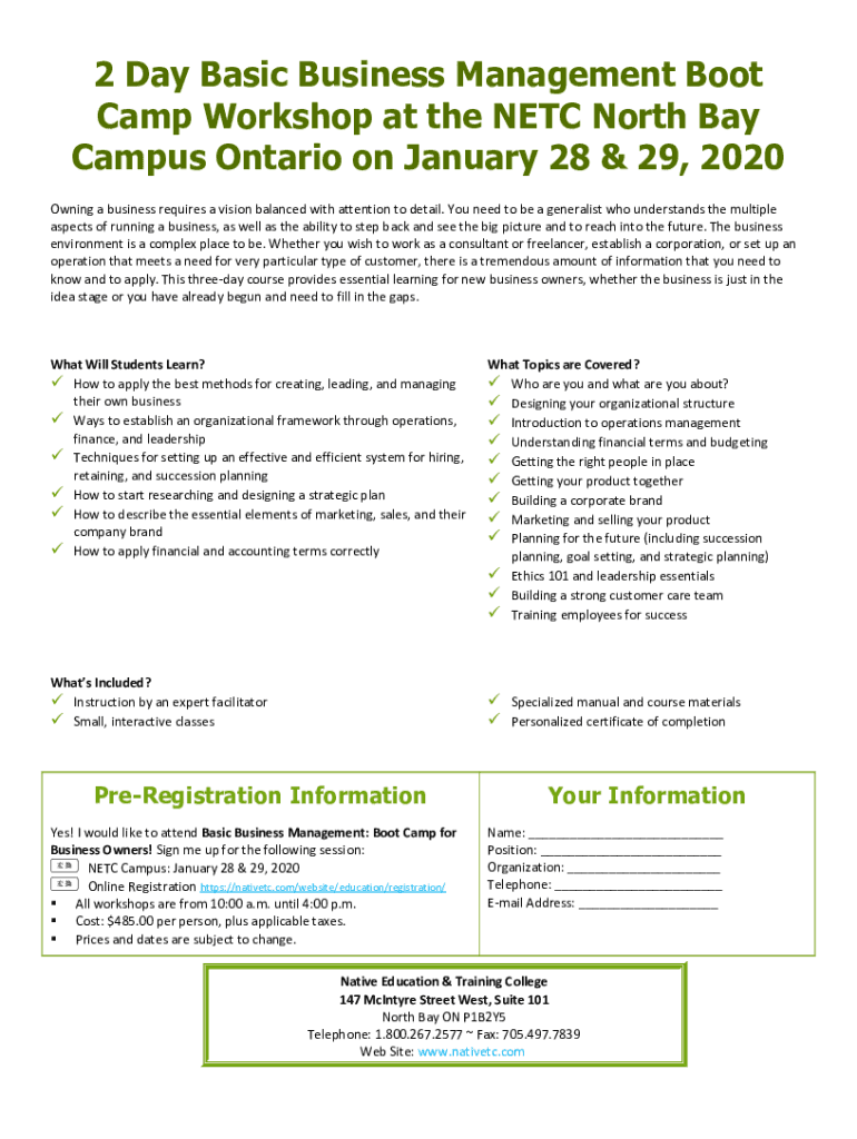 2 Day Basic Business Management Boot Camp Workshop at the ETC North Bay Campus Ontario on January 28 & 29, 2020 Owning a business requires a vision balanced with attention to detail. You need to be