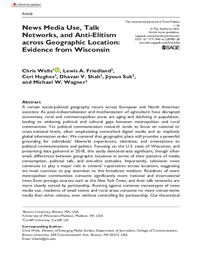 985128 researcharticle2021HIJXXX10.1177/1940161220985128The International Journal of Press/Politics Wells et al. Articles Media Use, Talk Networks, and Antisemitism across Geographic Location: Evidence