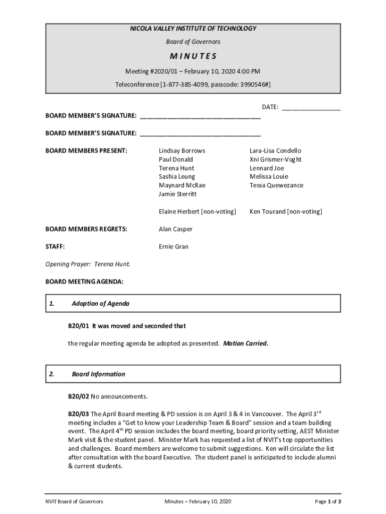 NICOLA VALLEY INSTITUTE OF TECHNOLOGY Board of GovernorsMINUTES Meeting #2020/01 February 10, 2020 4:00 PM Teleconference [18773854099, passcode: 3990546#] DATE: ___ BOARD MEMBERS SIGNATURE: ___ BOARD