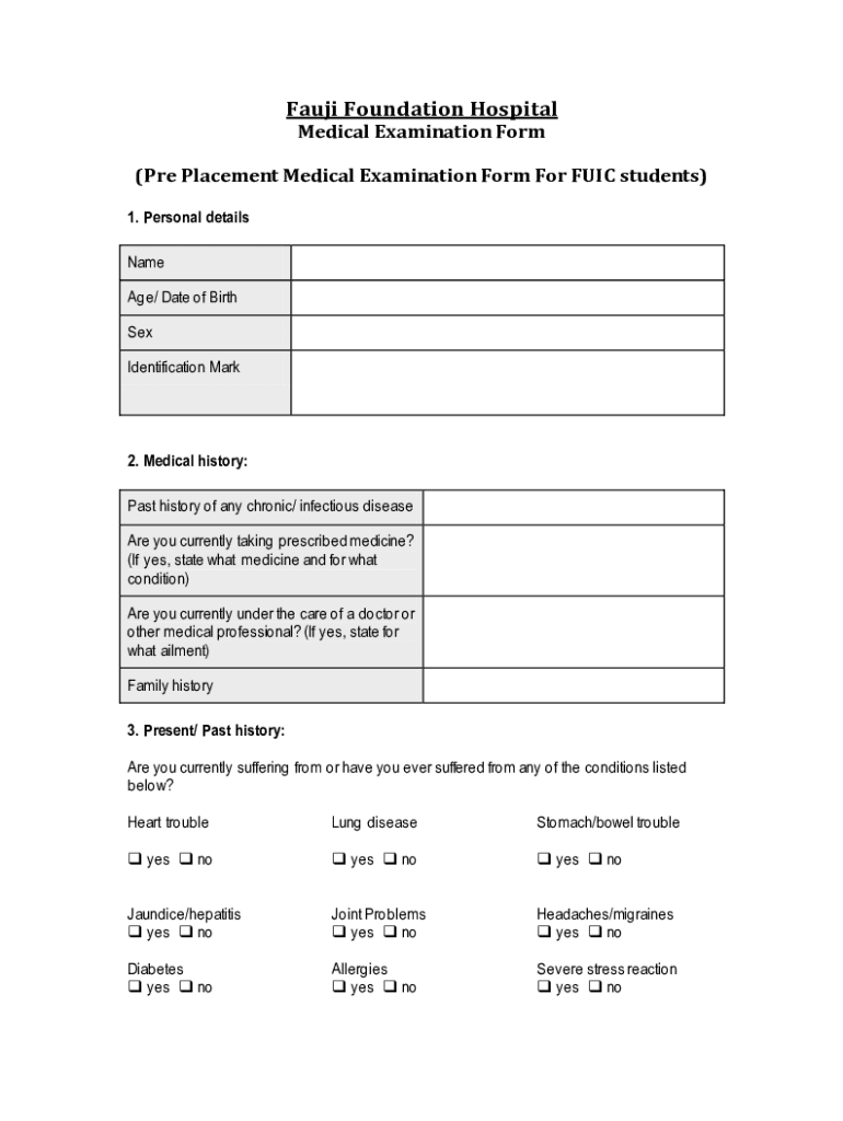 Fuji Foundation Hospital Medical Examination Form(PRE Placement Medical Examination Form For FDIC students) 1. Personal details Name Age/ Date of Birth Sex Identification Mark2. Medical history: Past