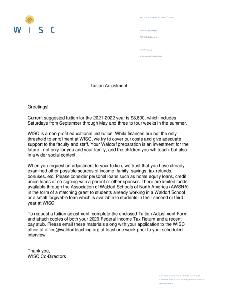 WALDORF INSTITUTE OF S SOUTHERN CALIFORNIA17100 SUPERIOR STREET NORTHRIDGE, CA 913251 877 394 1444 WWW. WALDORFTEACHING. Tuition AdjustmentGreetings! Current suggested tuition for the 20212022 year