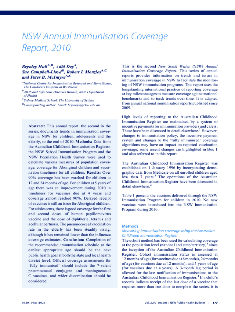 NSW Annual Immunization Coverage Report, 2010 Bradley Hull, D, Anti Day, Sue CampbellLloydB, Robert I. Menzies, C and Peter B. McIntyre, CA National Center for Immunization Research and Surveillance,