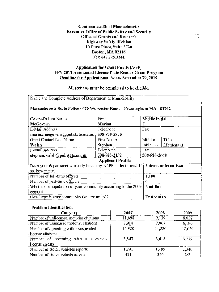 Commonwealth of Massachusetts Executive Office of Public Safety and Security Office of Grants and Research Highway Safety Division 10 Park Plaza, Suite 3720 Boston, MA 02116 Tel: 617.725.3341 Application