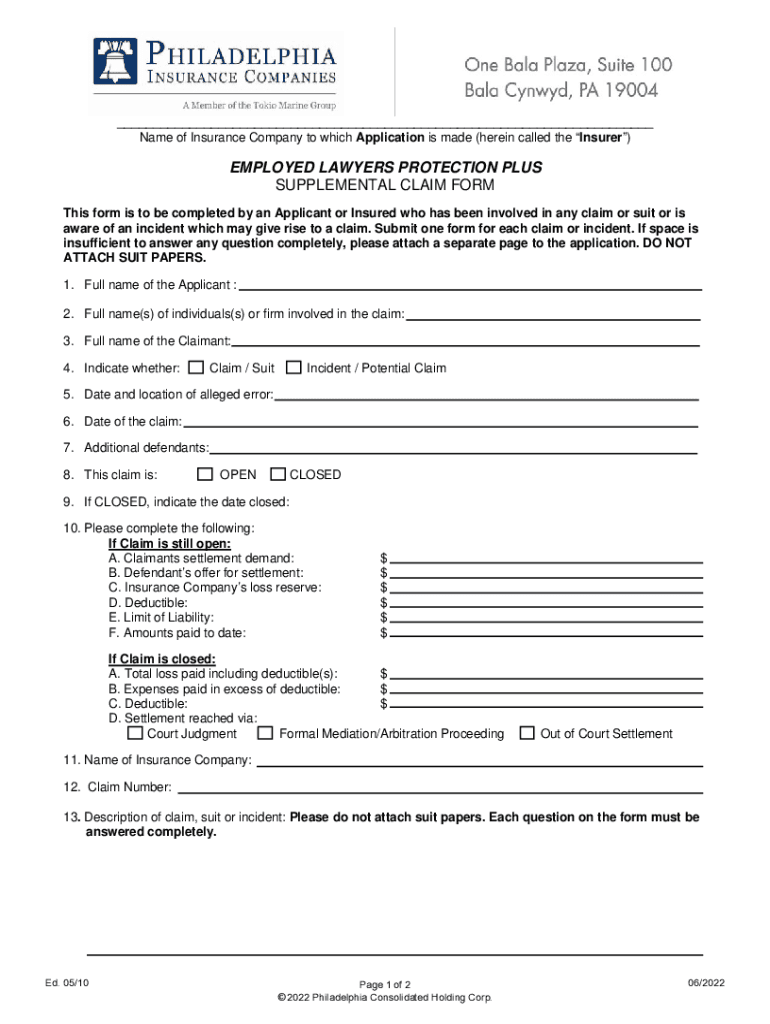 Print ApplicationClear Application___ Name of Insurance Company to which Application is made (herein called the Insurer)EMPLOYED LAWYERS PROTECTION PLUS SUPPLEMENTAL CLAIM FORM This form is to be
