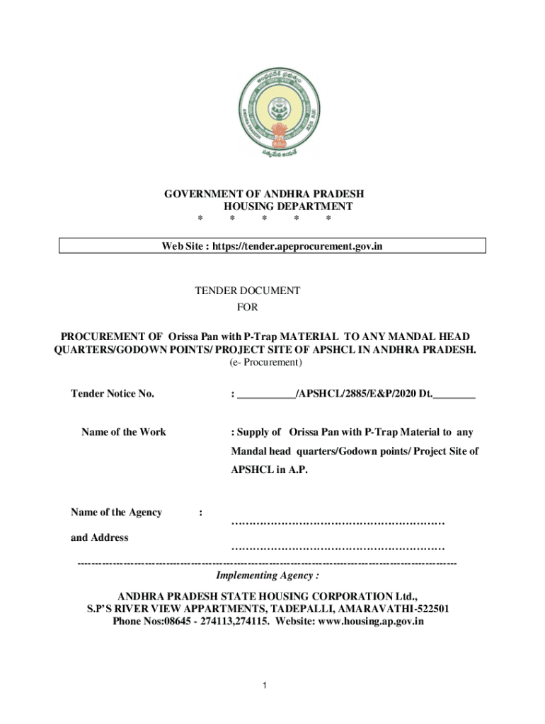 GOVERNMENT OF ANDHRA PRADESH HOUSING DEPARTMENT * * * * * Website : https://tender.apeprocurement.gov.inTENDER DOCUMENT FOR PROCUREMENT OF Odessa Pan with Trap MATERIAL TO ANY MANUAL Headquarters/DOWN