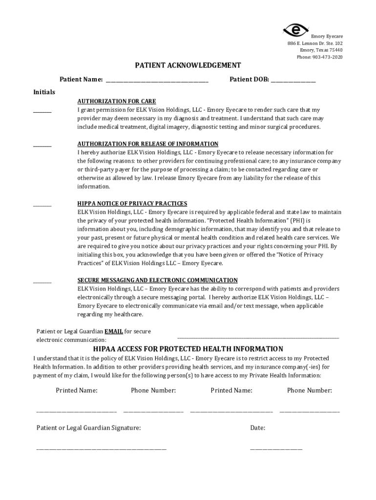 Emory eyecare pt acknow typically requires patient name, date of birth, and signature.