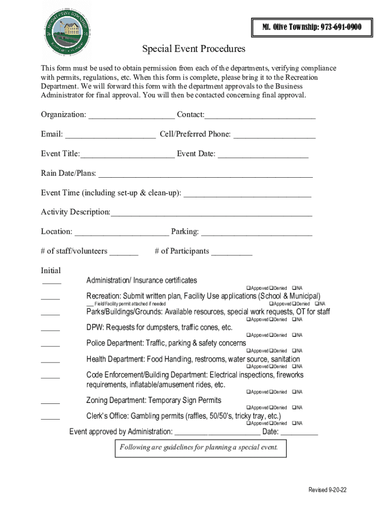 Mt. Olive Township: 9736910900Special Event Procedures This form must be used to obtain permission from each of the departments, verifying compliance with permits, regulations, etc. When this form
