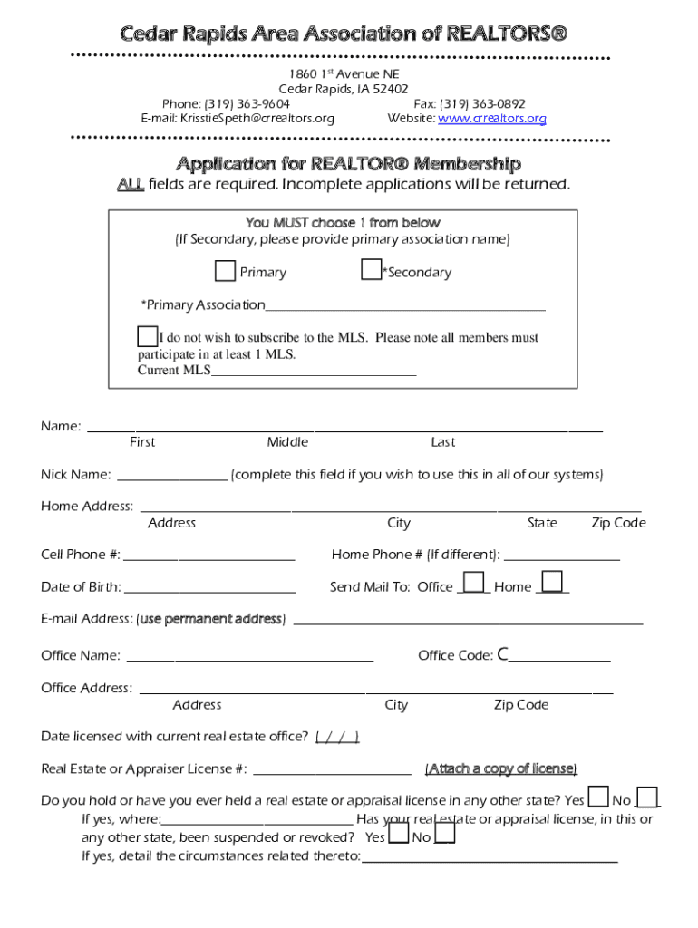 Cedar Rapids Area Association of REALTORS 1860 1st Avenue NE Cedar Rapids, IA 52402 Phone: (319) 3639604 Fax: (319) 3630892 Email: KrisstieSpeth@crrealtors.org Website: www.crrealtors.orgApplication
