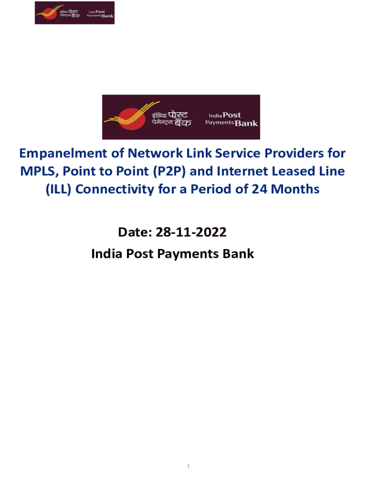 Embankment of Network Link Service Providers for MPLS, Point to Point (P2P) and Internet Leased Line (ILL) Connectivity for a Period of 24 Months Date: 28112022 India Post Payments Bank1Contents 1Introduction
