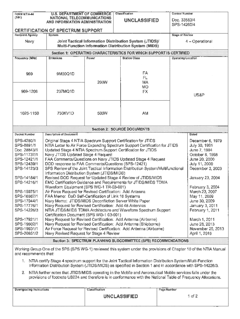 FORM NTIA44 (3/91)U.S. DEPARTMENT OF COMMERCE NATIONAL TELECOMMUNICATIONS AND INFORMATION ADMINISTRATIONClassificationControl Number. 33583/4 SPS14260/4UNCLASSIFIEDCERTIFICATION OF SPECTRUM SUPPORT