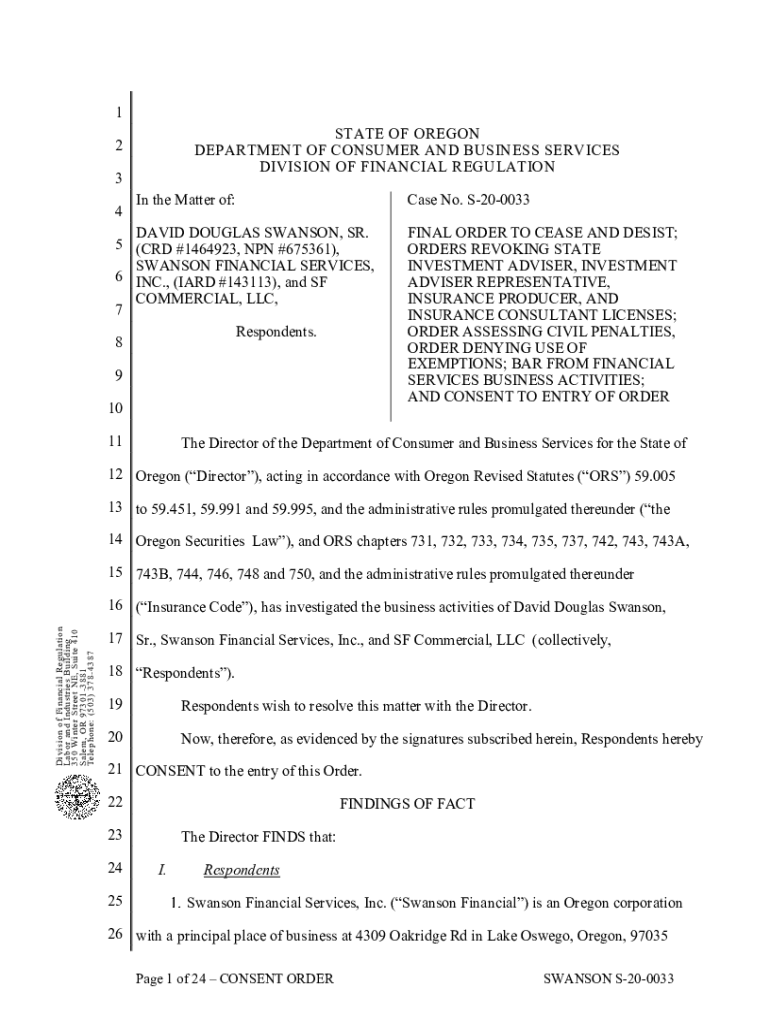 1 STATE OF OREGON DEPARTMENT OF CONSUMER AND BUSINESS SERVICES DIVISION OF FINANCIAL REGULATION2 3 4In the Matter of:Case No. S200033DAVID DOUGLAS SWANSON, SR. 5 (CRD #1464923, NPN #675361), SWANSON