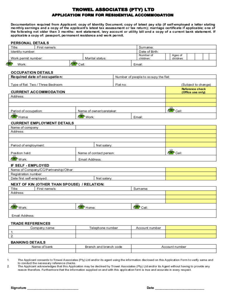 TROWEL ASSOCIATES (PTY) LTD APPLICATION FORM FOR RESIDENTIAL ACCOMMODATION Documentation required from Applicant: copy of Identity Document; copy of the latest payslip (if self-employed a letter stating