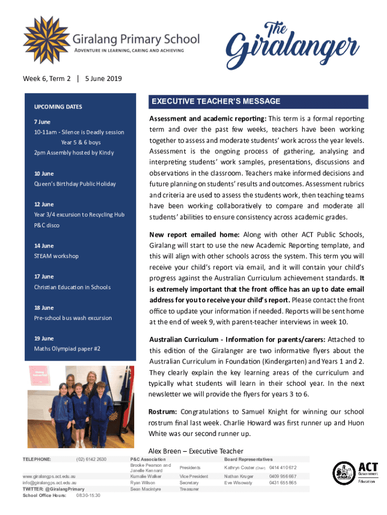 Week 6, Term 2 | 5 June 2019UPCOMING DATES 7 June 1011am Silence is Deadly session Year 5 & 6 boys 2pm Assembly hosted by Kind 10 June Queens Birthday Public Holiday 12 June Year 3/4 excursion to