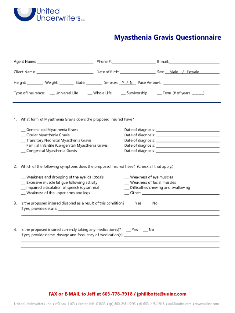 Myasthenia Graves Questionnaire Agent Name:Phone #:Email:Client Name:Date of Birth:Sex: ___Male/ Female__Height: ___ Weight: ___ State: ___ Smoker: __Y / N__ Face Amount: Type of Insurance:1.___ Universal